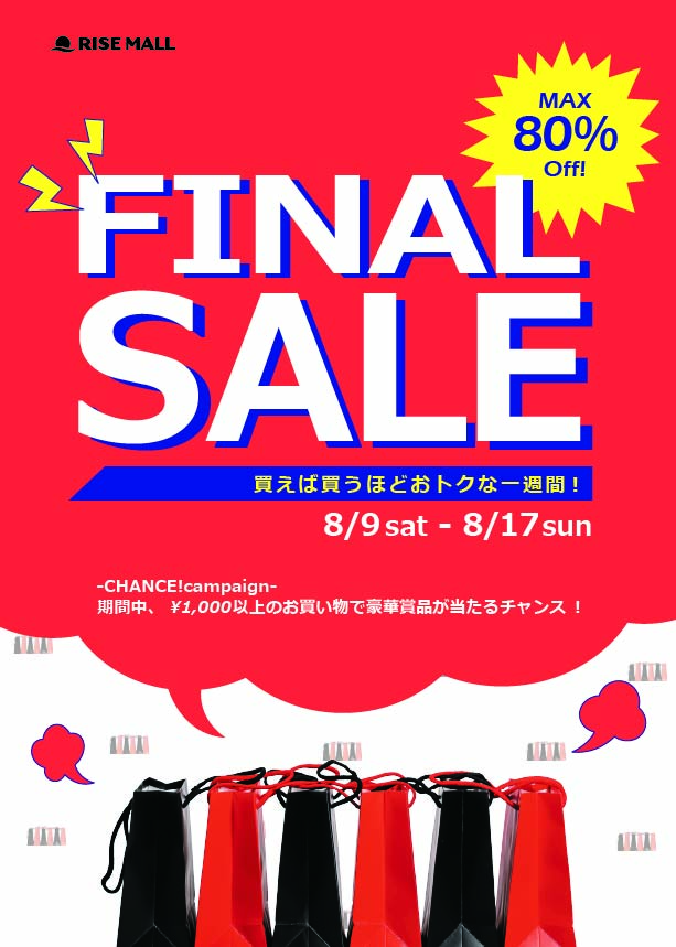 既存素材の大きな吹き出しをメインビジュアルとして活かし、視線が自然にタイトルへ集まるレイアウトを意識しました。強い赤を基調に、セールらしい躍動感とポップさを表現しています。背景に紙袋の写真を散りばめることで楽しさと期待感のあるデザインに仕上げました。